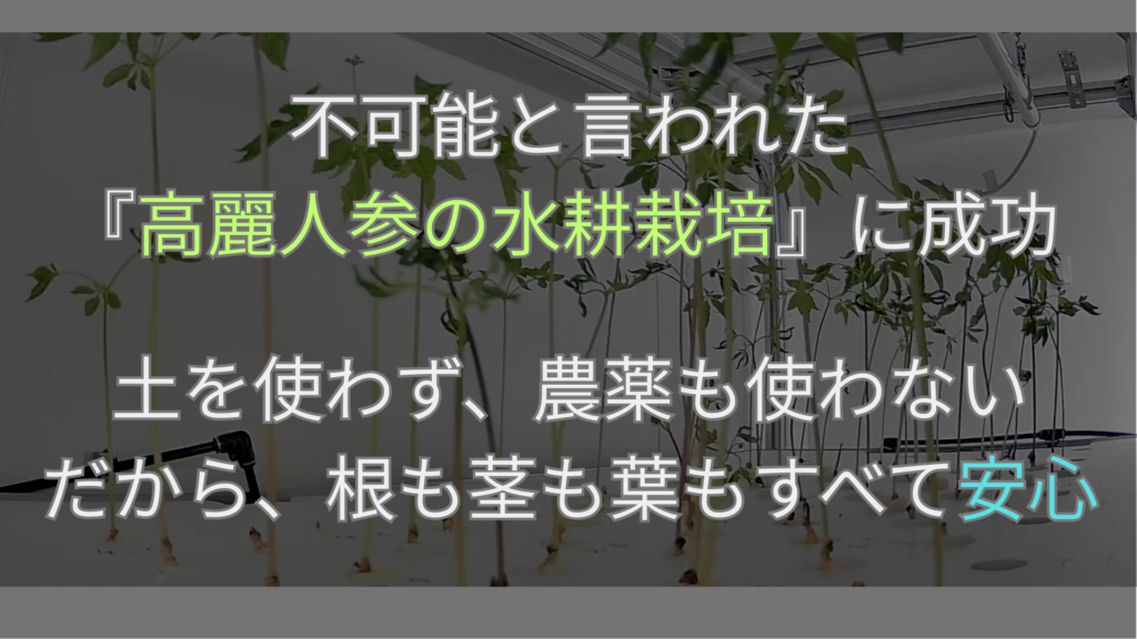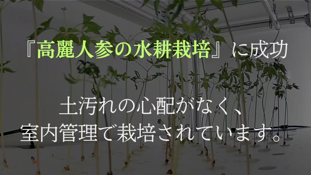 栽培の工夫として、一般的な土壌管理ではなく、水耕栽培に分類される独自の栽培システムを開発しました。根菜類である高麗人参は、一般的な水耕栽培では根が腐ってしまうという難点がありますが、私たちは独自の技術を用いることでこれを可能にしています。