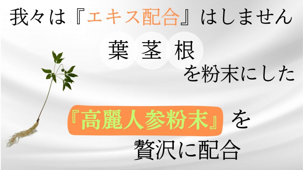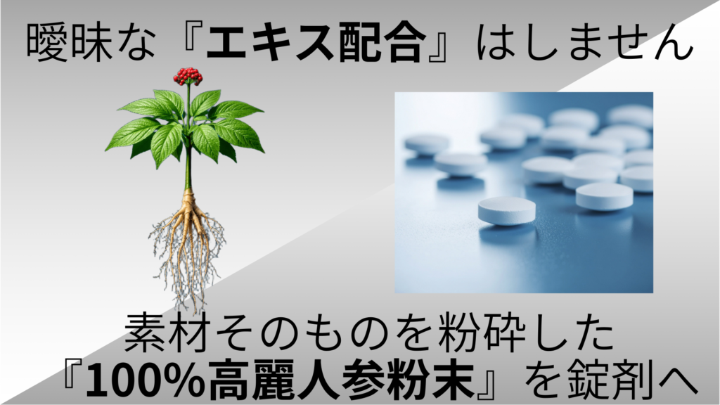 私たちは、曖昧な「エキス配合」という表現に頼りません。他社製品が含有量を曖昧にする中、私たちの製品は高麗人参の「乾燥粉末」を主体とし、どれだけ入っているか一目でわかる正直なものづくりを貫きます。この透明性こそが、私たちが本物の実感力を追求した結論です。