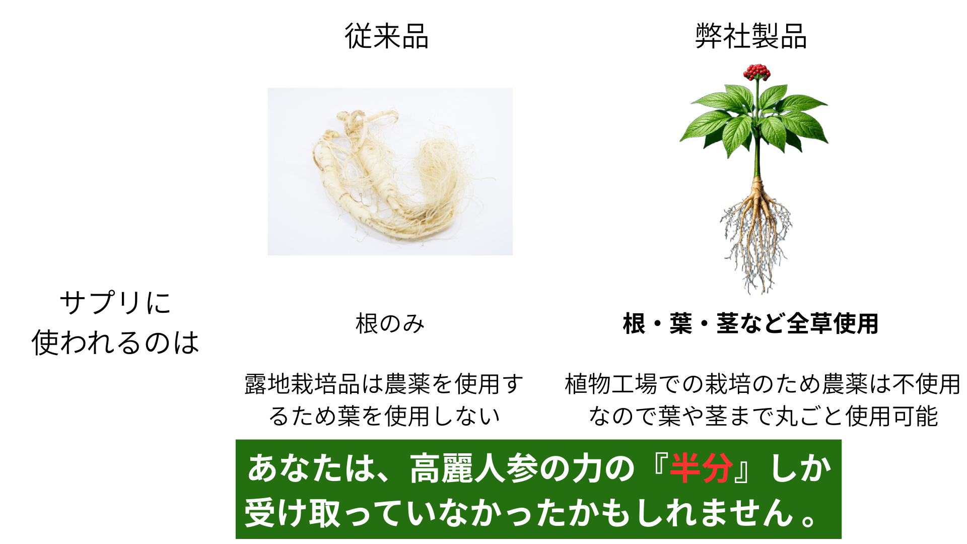 研究を深めるうち、私たちは市場のサプリメントに対する見過ごせない真実に気づきます。それは、市場の製品の多くが、輸入された高麗人参の**「根」の部分のみを使用している**という事実です。