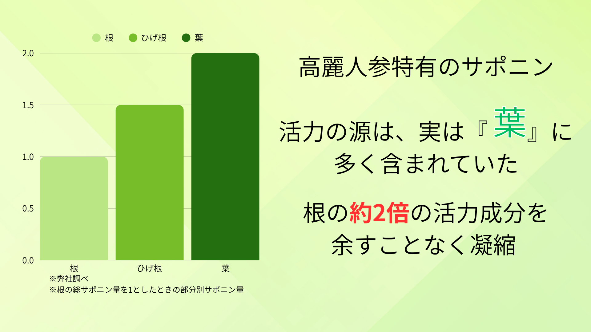 - 品質への結びつき: 根・茎・葉の異なる力が、お互いを補完し合う**「相乗効果」により、単一の部位を使う製品と比べ、より複合的で高い含有量**を実現しています。
